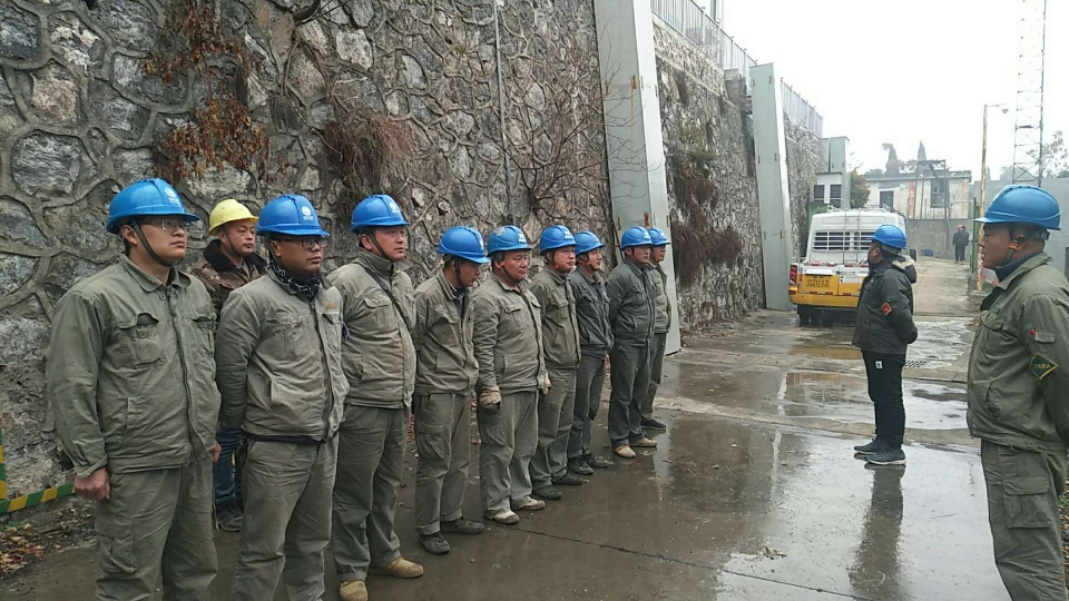 某藥廠變壓器增容改造現(xiàn)場,施工人員頂著寒風(fēng)冒著冷雨召開班前會(huì)